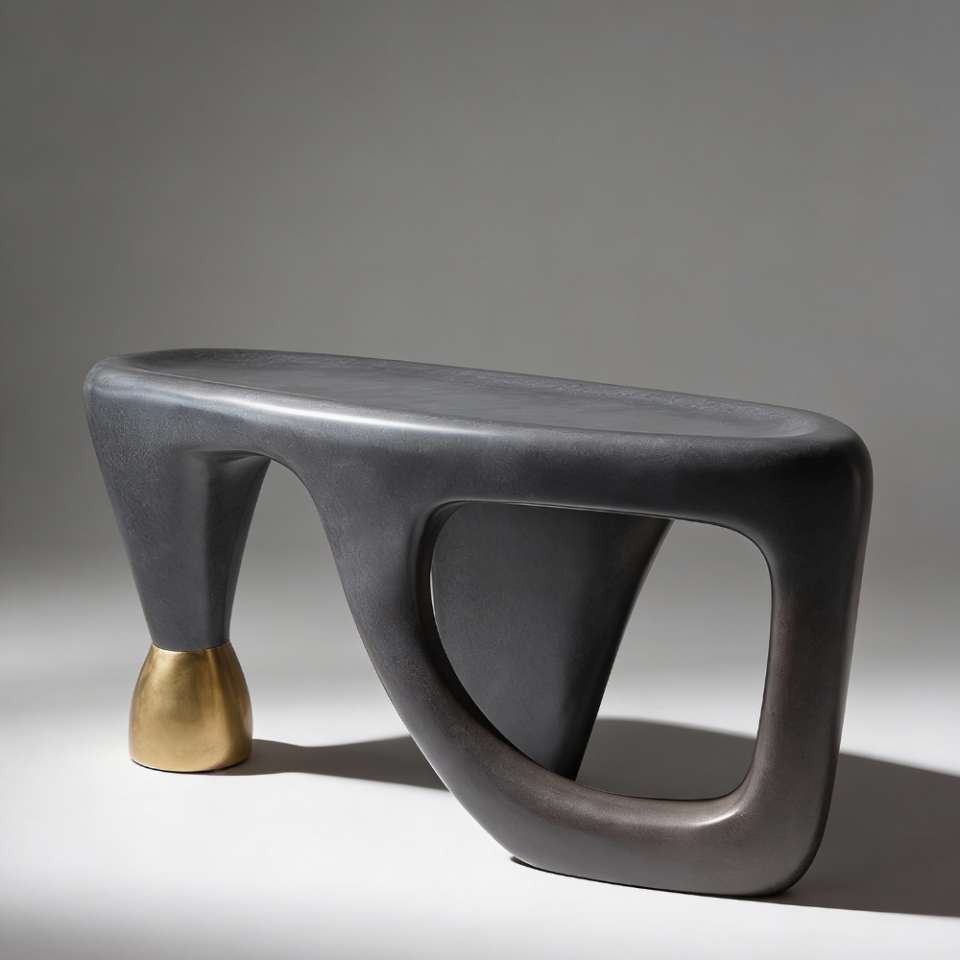 A minimalist lightweight concrete bench with bold curves and contrasting metal detailing for a contemporary edge.