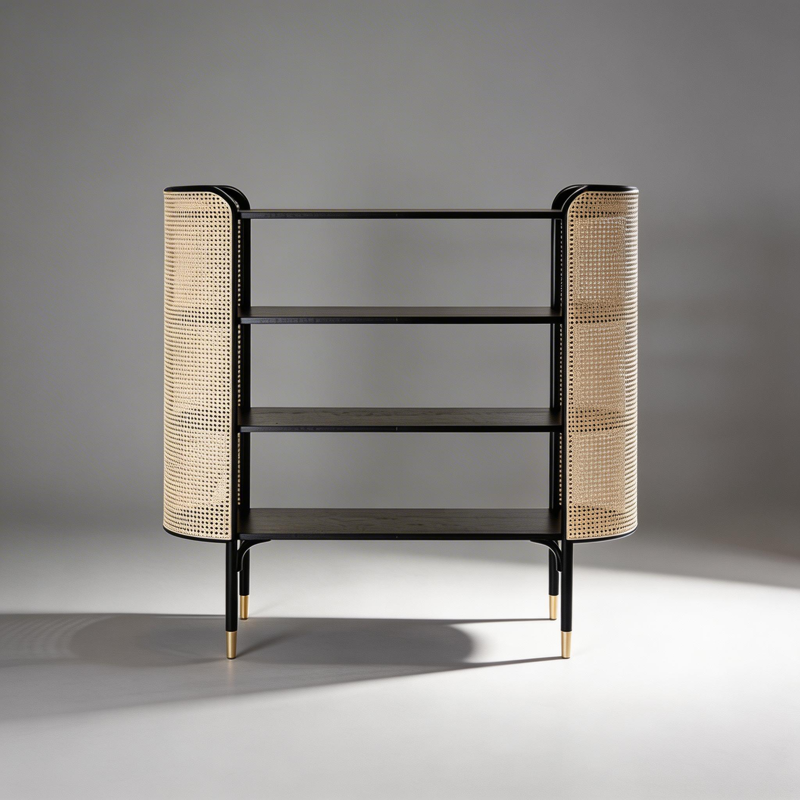 A sleek open-shelf unit featuring a bold black frame, woven cane side panels, and subtle brass-finished feet. Modern, airy, and perfect for stylish display and storage.