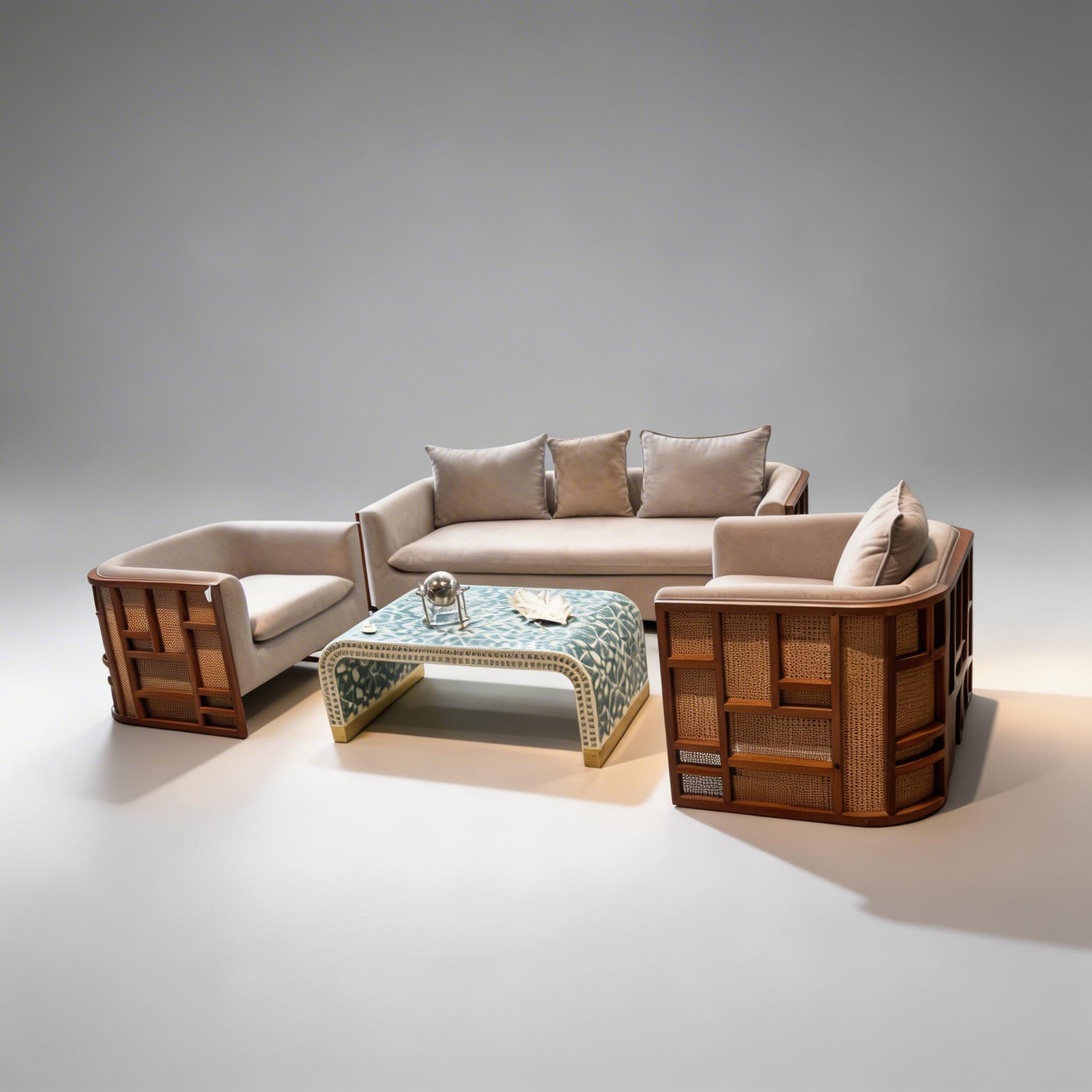 A modern seating ensemble featuring sculpted wooden frames, woven cane detailing, and soft neutral upholstery. Stylish, warm, and designed for refined contemporary spaces.