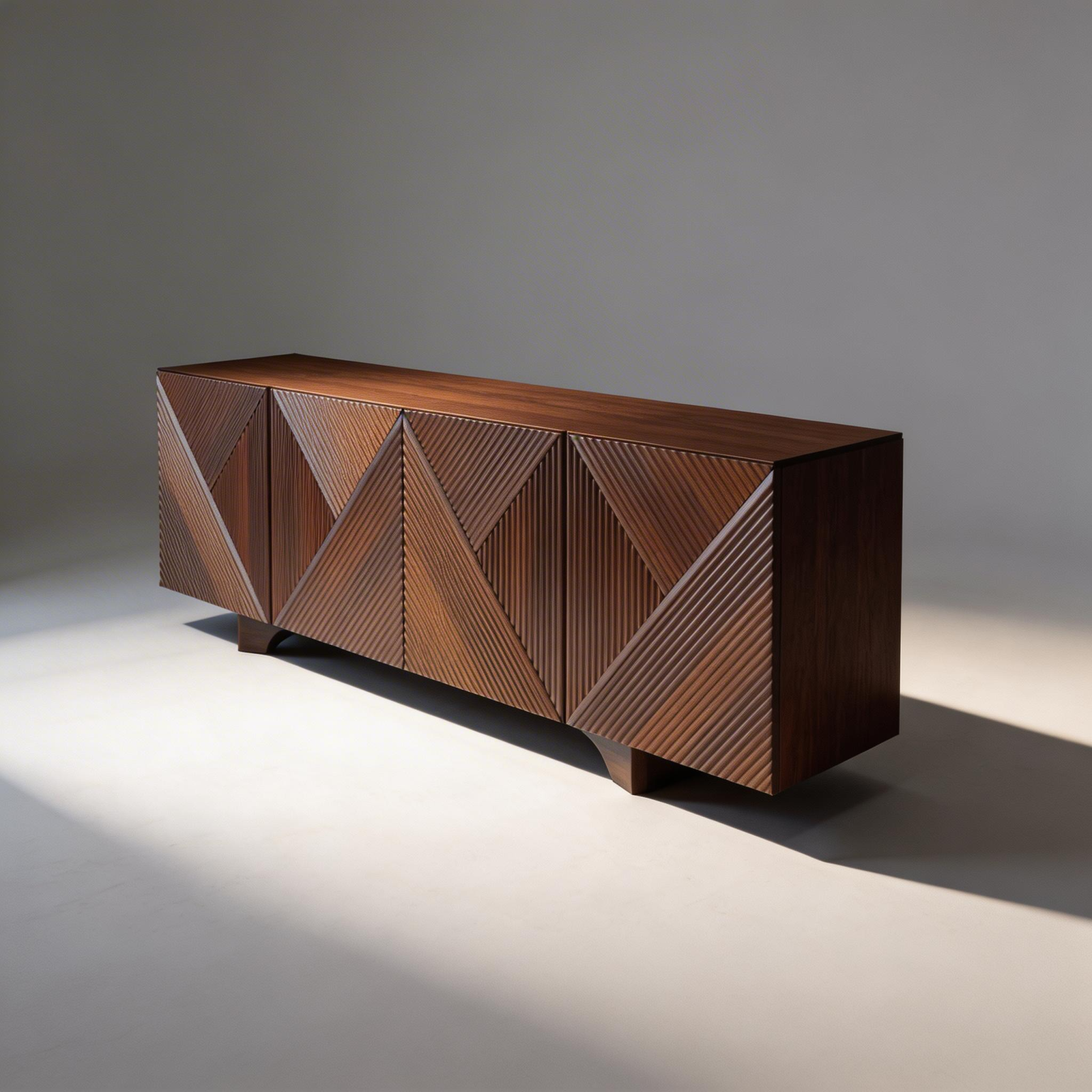 A contemporary console with bold triangular fluted panel detailing and a seamless wooden form. Textured, architectural, and designed to stand out.