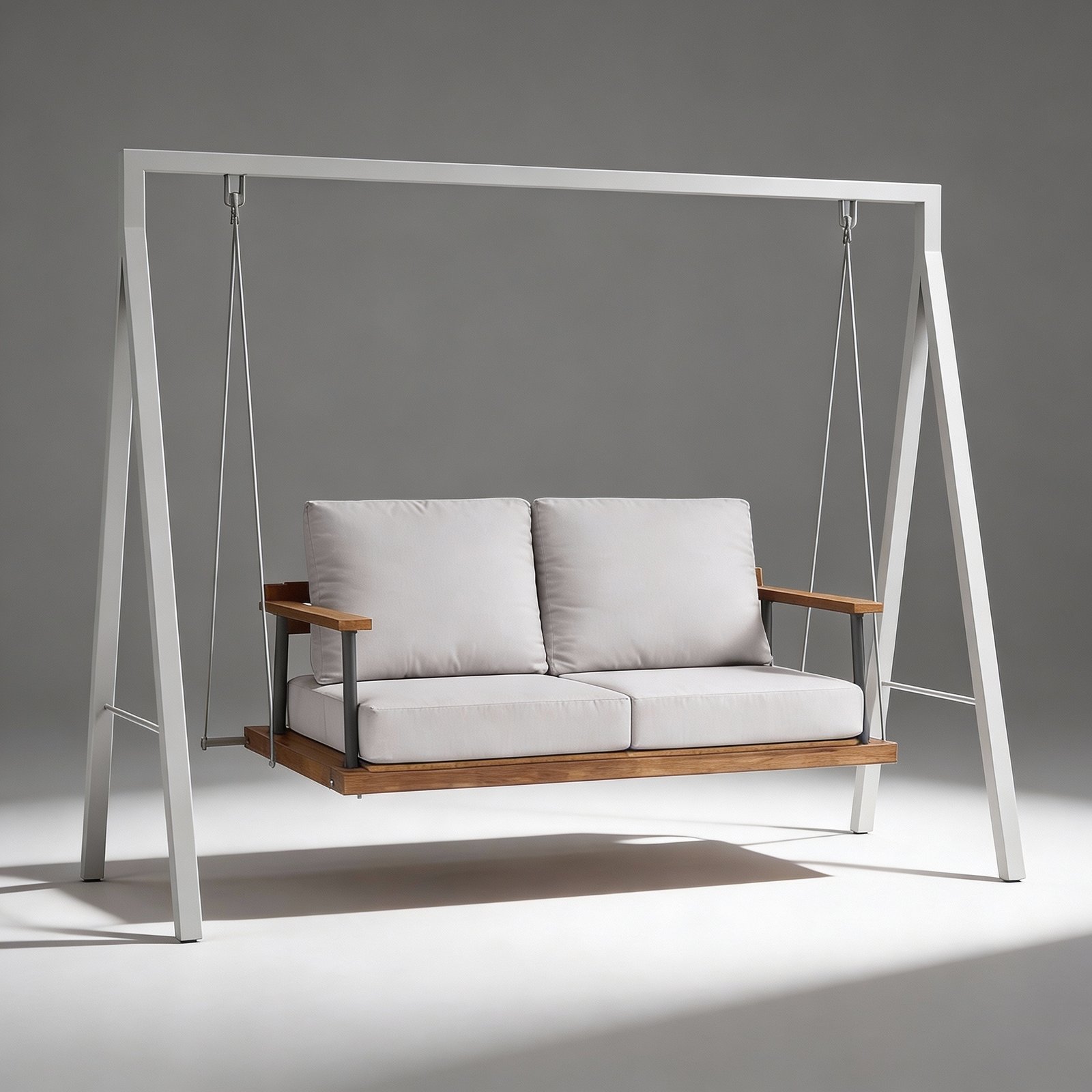 A clean, contemporary outdoor swing featuring a minimal metal frame, a solid wood seat base, and plush cushioned seating.
