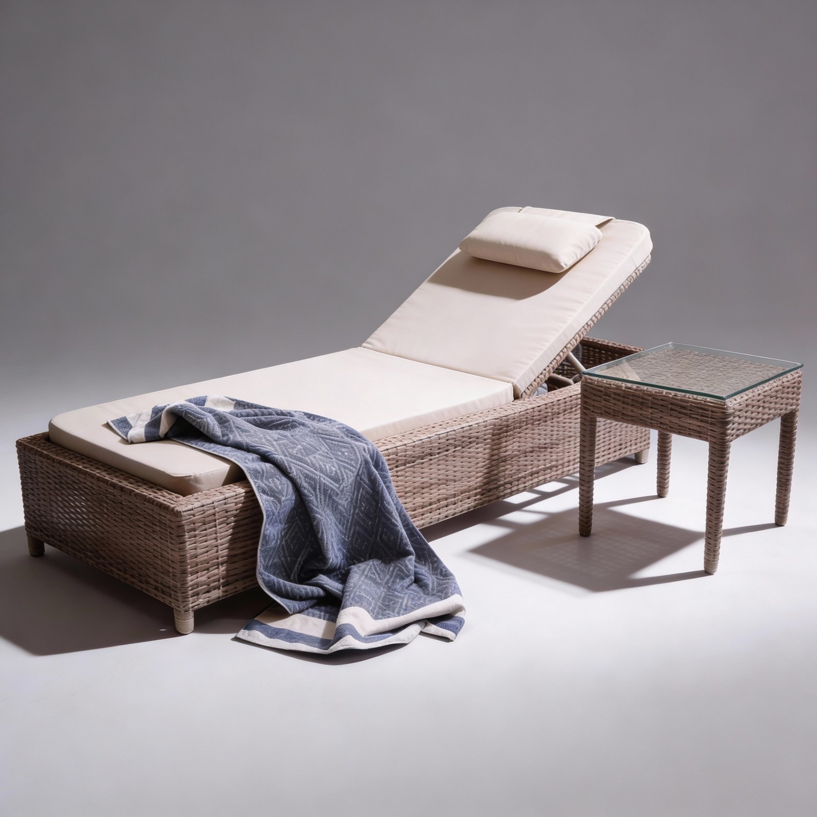 A matching side table adds functionality, making it ideal for poolside and terrace use.