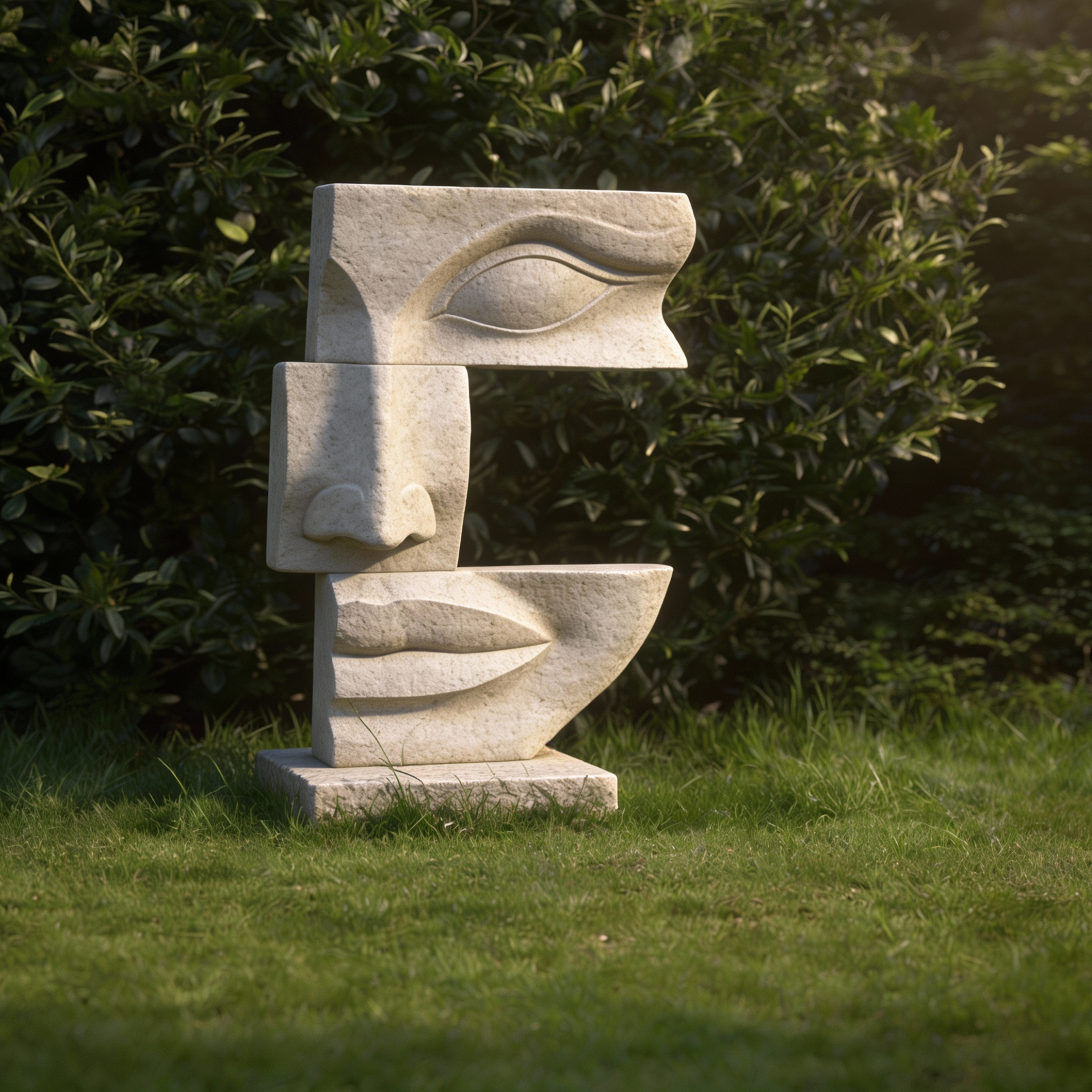 A modern stone sculpture defined by abstract facial forms and smooth contours.
