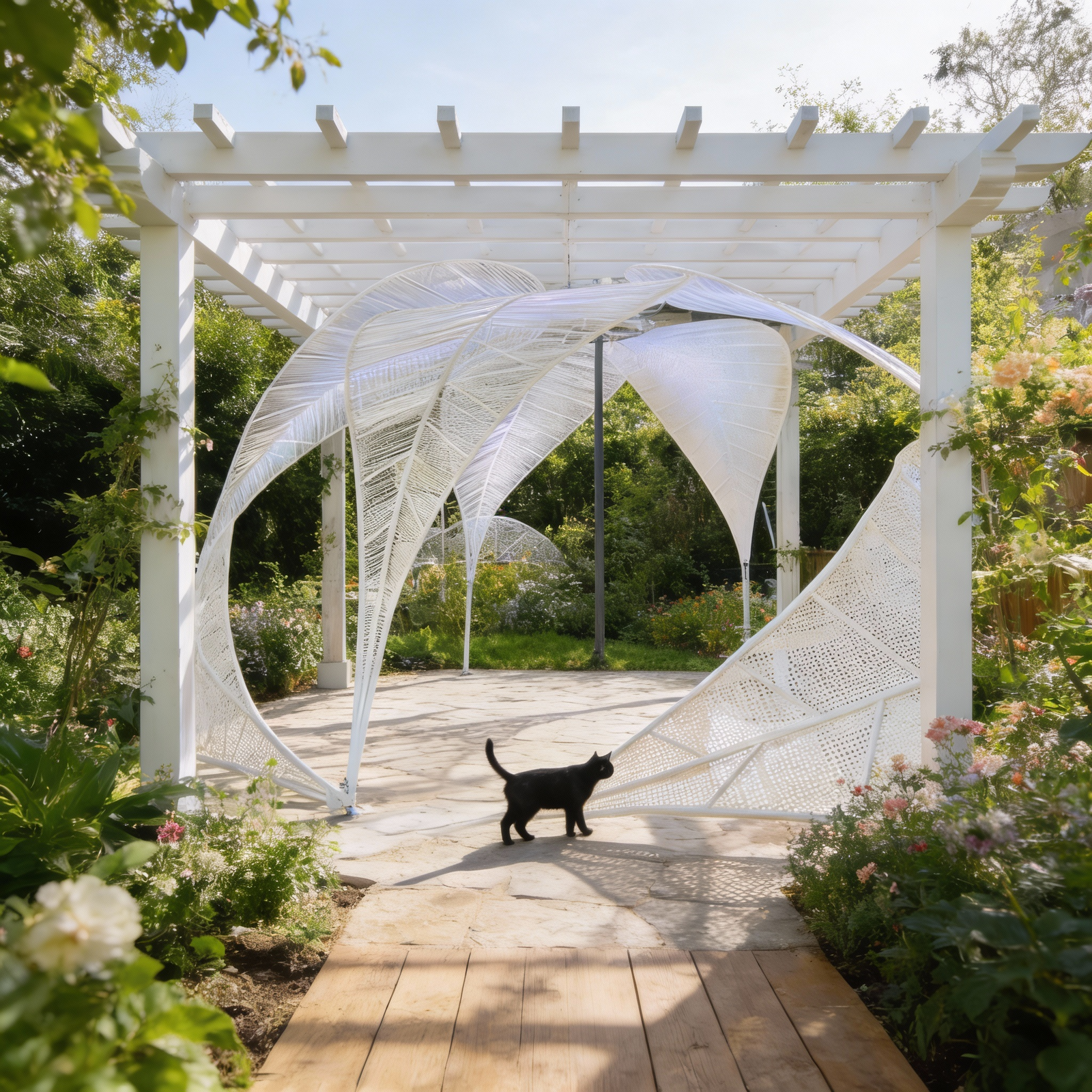 Leaf-pattern woven panels with a tensile structure create airy, self-supporting forms that balance lightness, airflow, and durability.