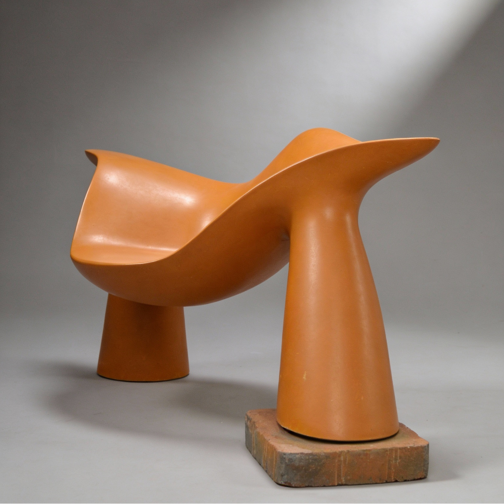 A statement lightweight concrete seat defined by flowing lines and a bold, artistic silhouette.