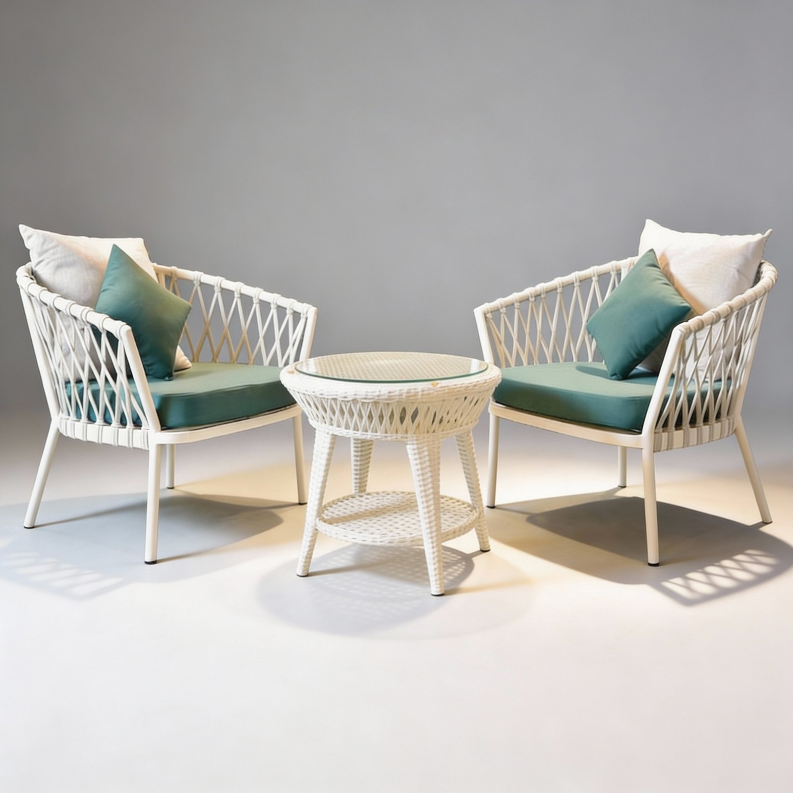 Paired with comfortable, weather-resistant cushions and a glass-top center table, it offers a fresh, contemporary seating solution for balconies and outdoor spaces.